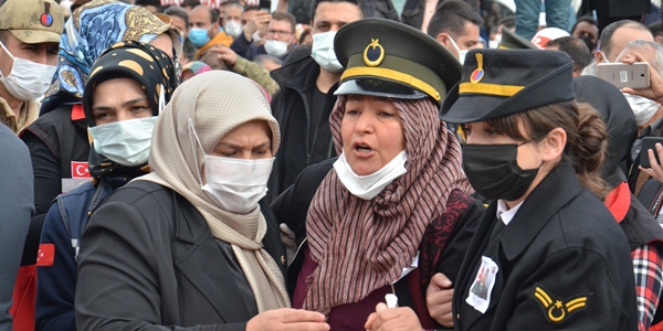 Şehidin eşi Gizem Yılmaz ise, ayakta durmakta güçlük çekti. Şehit eşinin cenazesini taşıyan araca bakıp, ‘İçindeki benim eşim olamaz’ diyerek eşinin şehit düştüğünü kabullenmek istemedi.