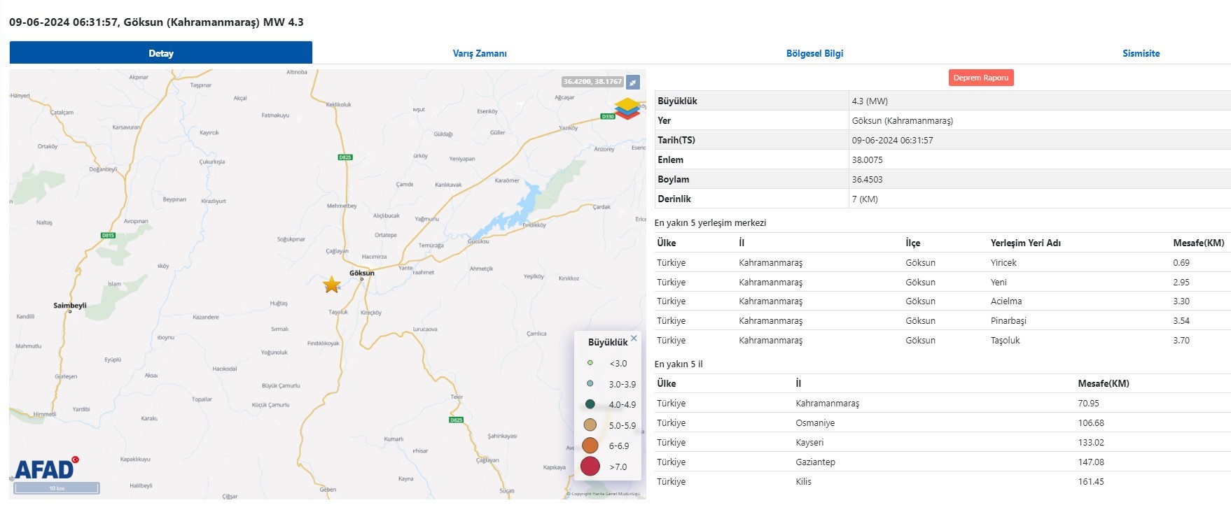 AFAD sosyal medya hesabından "Kahramanmaraş'ın Göksun ilçesinde saat 06.31'de, yerin 7 kilometre derinliğinde deprem meydana geldi." ifadelerini kullandı.