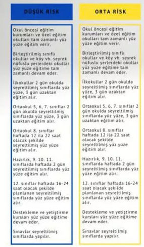Cumhurbaşkanı Recep Tayyip Erdoğan, toplantıda düşük, orta, yüksek ve çok yüksek riskli olarak dört kategoriye ayrılan illerdeki risk durumuna göre yüz yüze eğitimin hangi illerde ne şekilde başlayacağını tek tek açıkladı. Kabine toplantısının ardından açıklama yapan Cumhurbaşkanı Recep Tayyip Erdoğan, "Okullar tüm okul öncesi eğitim kurumları ilkokullarda 8. ve 12. sınıflarda eğitim öğretime açılacaktır. Düşük ve orta riskli illerde eğitim, öğretime başlanacak. Yüksek ve çok yüksek riskli illerde sadece liselerde yüz yüze sınavlarda yapılacak." şeklinde konuştu.