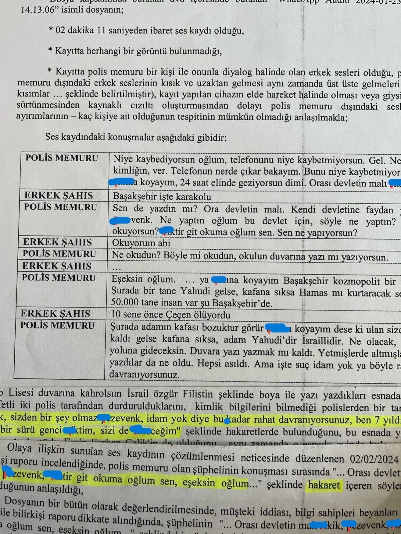 Olayın en dikkat çekici boyutu ise gencin karakola götürülmeden önce görevli polis memurunun genç hakkında kullandığı hakaret içerikli ifadeler oldu. Yaşananların ses kaydıyla belgelenmesi ve bilirkişi raporuyla doğrulanmasına rağmen, ilgili polis hakkında sadece sembolik bir işlem yapıldığı öğrenildi.