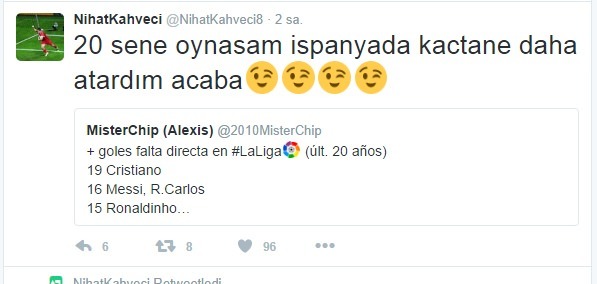 Nihat Kahveci'den anlamlı tweet... Bir hesabın paylaştığı "La Liga'da son 20 yılda frikik golleri atanlar" listesini retweet eden Nihat Kahveci, "20 sene oynasam İspanya'da kaç tane daha atardım acaba?" yorumu ve eklediği "gülen surat" emojileriyle Messi, Cristiano Ronaldo, Roberto Carlos gibi isimlerin bulunduğu listede ilk sıralarda olabileceğini ima etti.