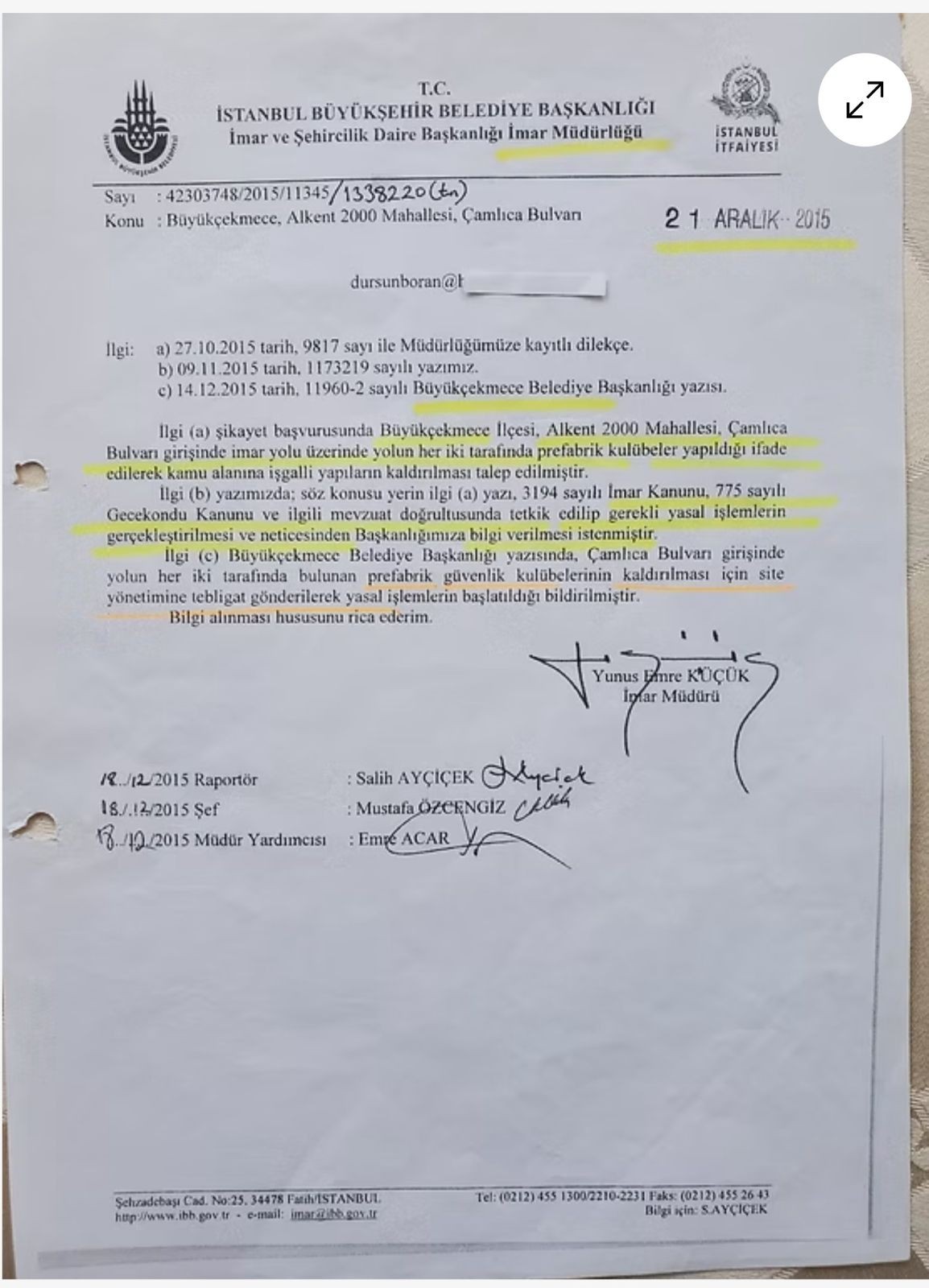 İBB İmar Daire Başkanlığı’nın 21 Aralık 2015 tarihinde 1338220 sayılı kararla yıkım kararı verdiği fakat uzun yıllardır başkanlık koltuğunda oturan CHP’li Hasan Aygün’ün, yıkım kararını uygulamadığı öğrenildi.