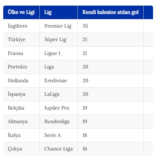 Avrupa'nın en büyük 10 ligi içinde kıtanın 5 büyük futbol organizasyonuna sahip İngiltere (Premier Lig), İspanya (LaLiga), İtalya (Serie A), Almanya (Bundesliga) ve Fransa'nın (Ligue 1) yanı sıra Portekiz, Hollanda, Belçika, Türkiye ve Çekya liglerinde bu sezon şimdiye kadar kendi kalesine atılan gol sayıları dikkati çekiyor.