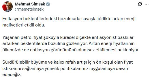 Hazine ve Maliye Bakanı Mehmet Şimşek, enflasyon beklentilerinde savaşla birlikte artan enerji maliyetlerinin etkili olduğunu belirterek, "Sürdürülebilir büyüme ve kalıcı refah artışı için ön koşul olan fiyat istikrarını sağlamaya yönelik politikalarımızı uygulamaya devam edeceğiz" ifadesini kullandı.
