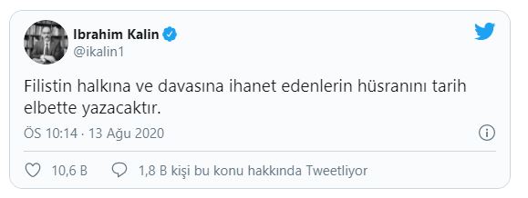 Cumhurbaşkanlığı Sözcüsü İbrahim Kalın, Twitter'dan, İsrail ile BAE arasında varılan anlaşmaya ilişkin olarak yapmış olduğu açıklamada, "Mazlum Filistin halkına ve davasına ihanet edenlerin (BAE) hüsranını tarih elbette yazacaktır." diyerek sert tepki gösterdi.
