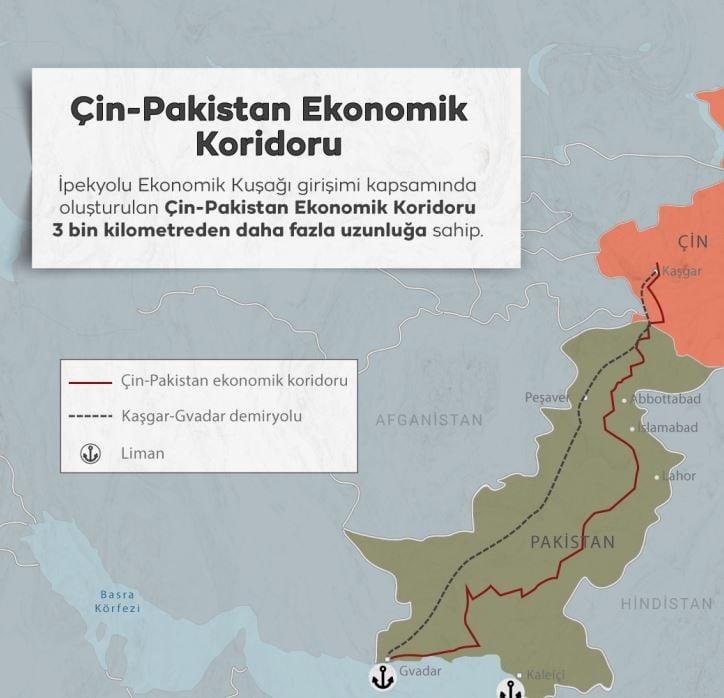Çin'in kuzeybatısındaki Sincan Uygur Özerk Bölgesi'ni, Pakistan'ı kuzeydoğu-güneybatı yönünde kat ederek Gwadar ve Karaçi limanlarıyla Umman Denizi'ne bağlamayı amaçlayan "Çin-Pakistan Ekonomik Koridoru" (CPEC) projesi, Kuşak ve Yol Girişimi'nin kalbinde yer alıyor.