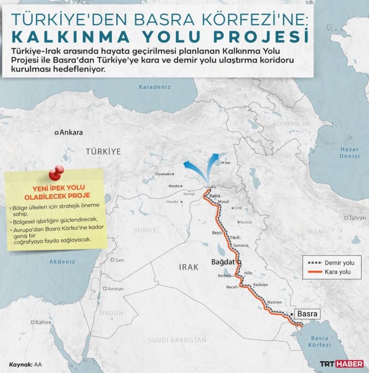 Kalkınma Yolu Projesi, 1200 kilometrelik demir yolu ve otoyol ile Türkiye'yi Basra Körfezi'ndeki Faw Limanı'na bağlayacak. Yeni İpek Yolu olarak tanımlanan proje, Avrupa'dan Körfez ülkelerine kadar geniş bir bölgeyi etkileyecek ve ortak fayda üretecek.