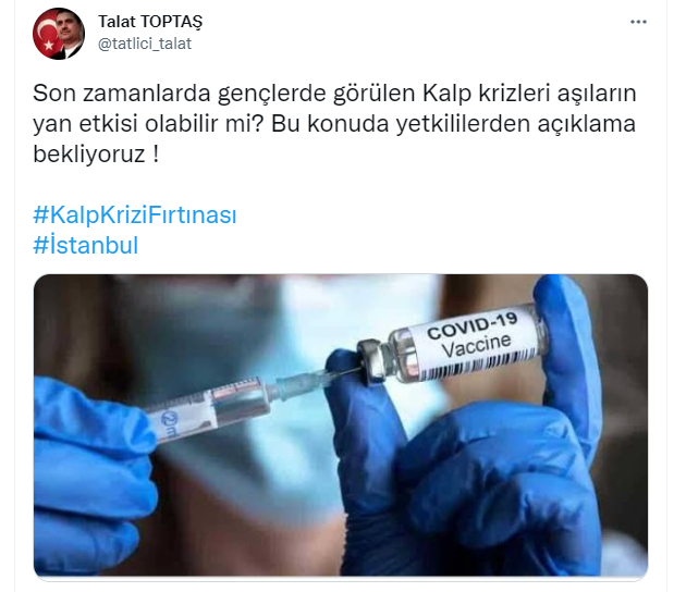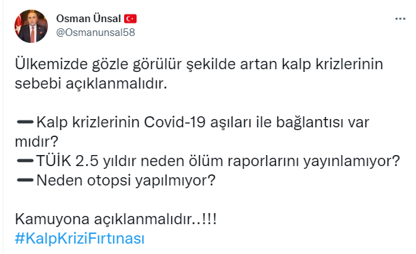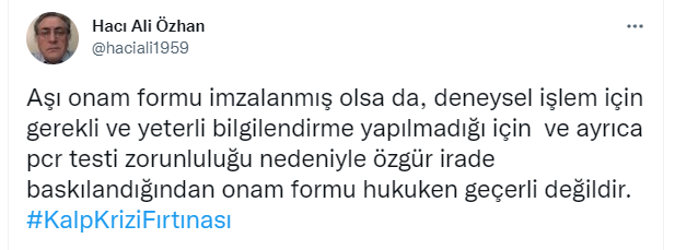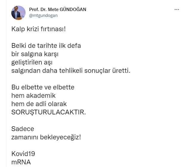 Prof. Dr. Mete Gündoğan da "Kalp krizi fırtınası!" paylaşımlarına destek vererek, "Belki de tarihte ilk defa bir salgına karşı geliştirilen aşı salgından daha tehlikeli sonuçlar üretti." dedi.