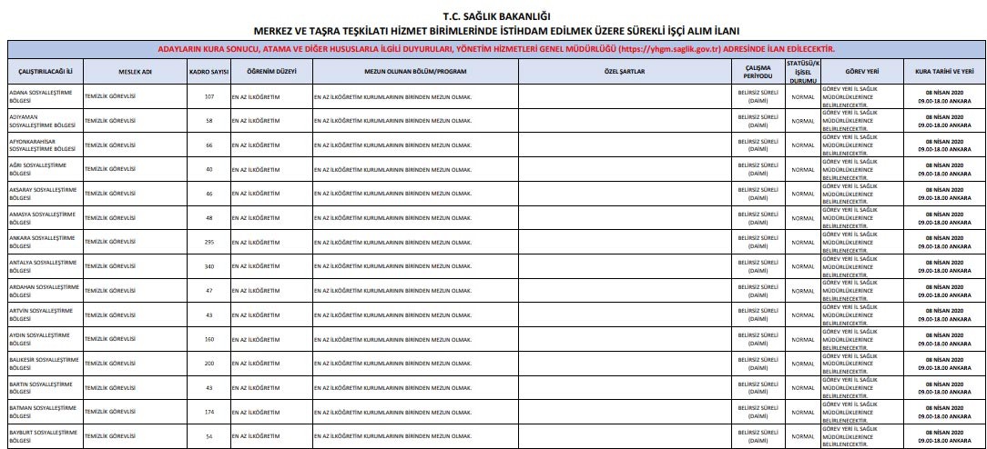 Sağlık Bakanlığı İŞKUR üzerinden 10 bin 998 bin temizlik görevlisi, 2 bin silahsız güvenlik görevlisi, klinik destek elamanı bin, 2 aşçı olmak üzere toplamda 14 bin personel alımı yapmakta. İşte Sağlık Bakanlığı sürekli işçi alımı başvuru şartları.