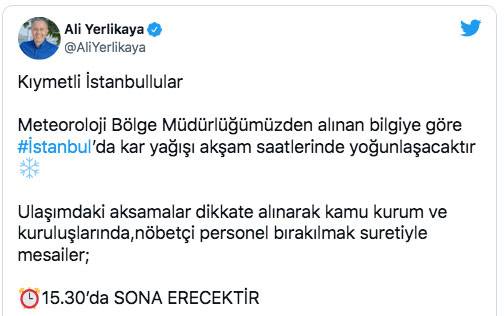Son dakika! İstanbul Valisi Ali Yerlikaya'dan son dakika mesai saati açıklaması geldi. İstanbul Valisi Ali Yerlikaya: İstanbul'da kar yağışı akşam saatlerinde yoğunlaşacak. Ulaşımdaki aksamalar dikkate alınarak kamu kurum ve kuruluşlarında mesailer, nöbetçi personel bırakılmak suretiyle 15.30'da sona erecek.