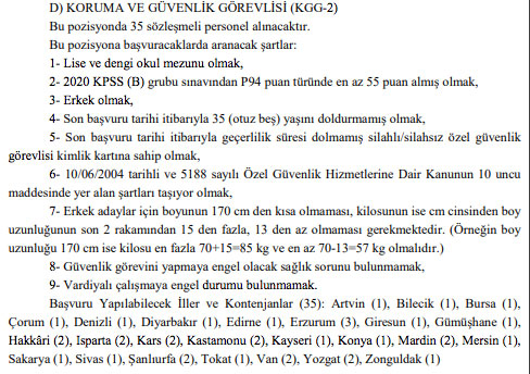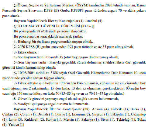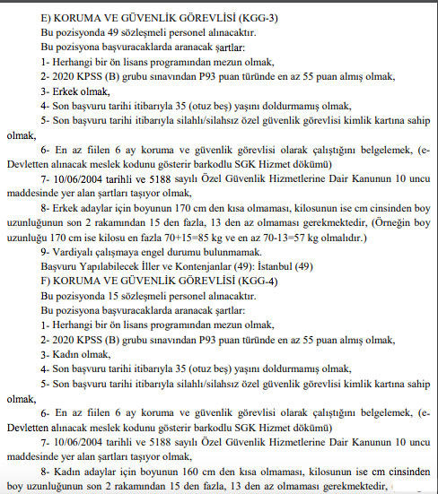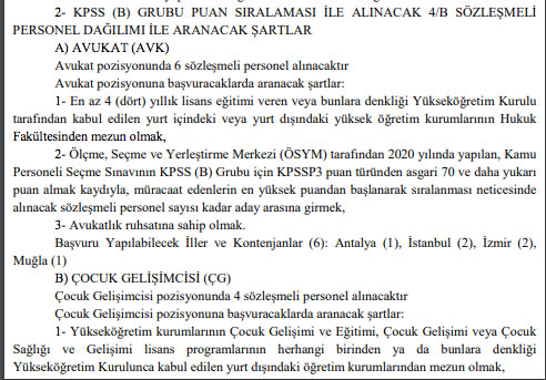 Bakanlığın bir başka ilanında ise taşra teşkilatında istihdam edilmek üzere yazılı ve sözlü sınav yapılmaksızın 6 avukat, 4 çocuk gelişimcisi, 127 koruma ve güvenlik görevlisi olmak üzere toplam 137 sözleşmeli personel alınacağı duyuruldu.