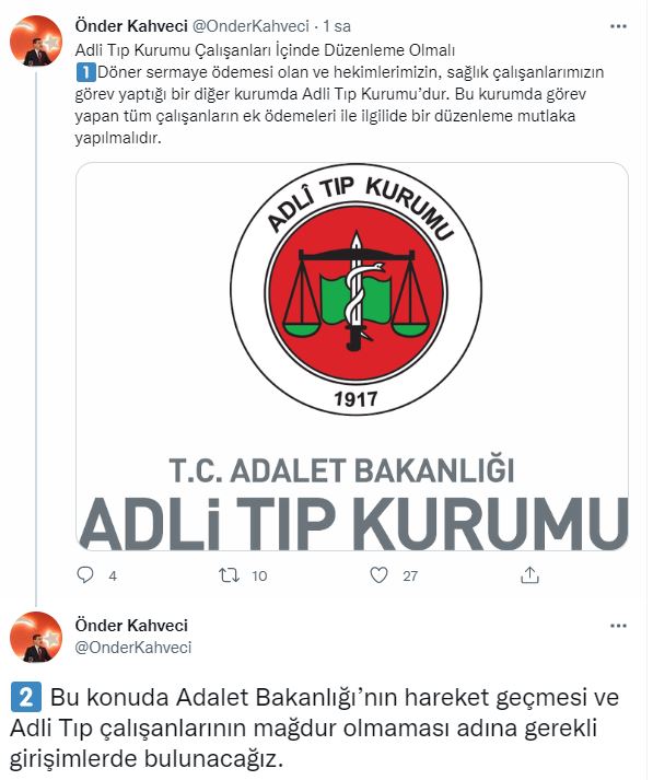 “Adli Tıp Kurumu Çalışanları İçinde Düzenleme Olmalı” diyen Kahveci yaptığı paylaşımda, “Döner sermaye ödemesi olan ve hekimlerimizin, sağlık çalışanlarımızın görev yaptığı bir diğer kurumda Adli Tıp Kurumu’dur. Bu kurumda görev yapan tüm çalışanların ek ödemeleri ile ilgilide bir düzenleme mutlaka yapılmalıdır. Bu konuda Adalet Bakanlığı’nın hareket geçmesi ve Adli Tıp çalışanlarının mağdur olmaması adına gerekli girişimlerde bulunacağız” dedi.