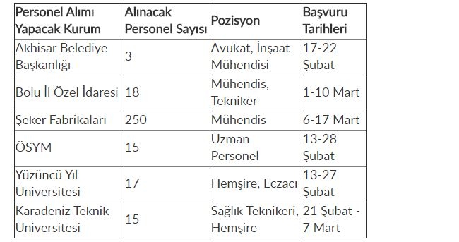 Bugün yani 19 Şubat 2017 tarihi itibarıyla duyurusu yapılan personel alımları şu şekilde: