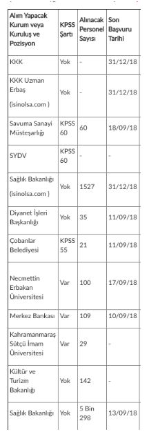 Kamu kurum ve kuruluşları personel alımlarını genellikle KPSS puanıyla almakta. Ancak bazı durumlardan alımlar KPSS şartı aranmaksızın yapılmakta. Milli Eğitim, Çalışma ve diğer bakanlıklar İŞKUR üzerinden KPSS şartı aranmaksızın personel alımı yapmakta. Bu bağlamda kamuya toplamda 12 bin 120 memur ve personel alımı yapılacak.