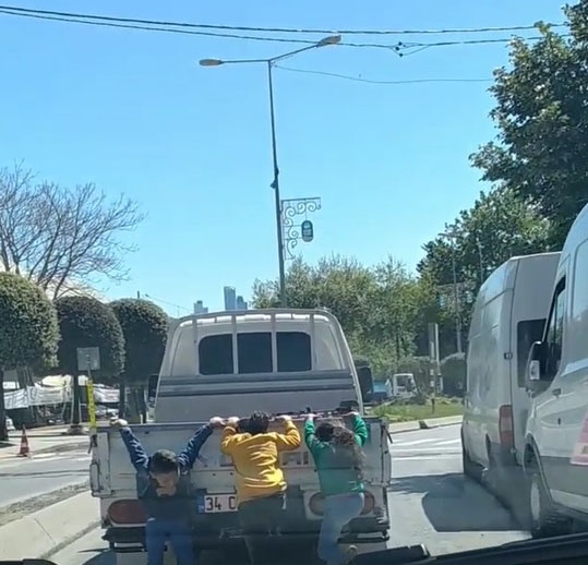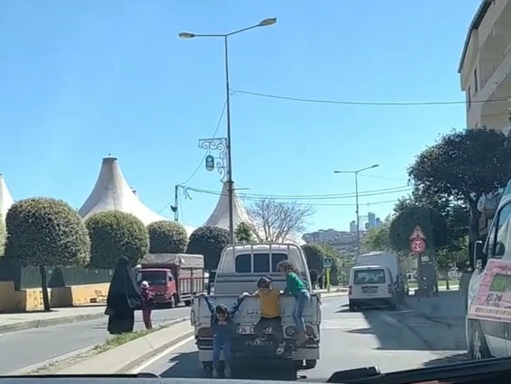 Sorumsuz kamyonet sürücüsü, hem çocukların canını hem de trafiğin güvenliğini hiçe saydı. O anlar yoldaki başka sürücü tarafından cep telefonu kamerasınca kaydedildi. Görüntülerde kamyonet ilerlerken kamyonetin kasasından sarkan 3 çocuk yolculuk ediyor.