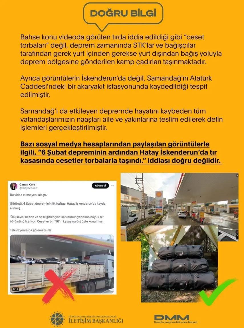 Açıklamada, görüntülerin İskenderun değil, Samandağ ilçesindeki bir akaryakıt istasyonunda kaydedildiği tespit edildi. İddiaların tamamen yanlış olduğunu belirten açıklamada, "6 Şubat depreminin ardından Hatay İskenderun'da tır kasasında cesetler torbalarla taşındı." ifadesinin doğru olmadığı vurgulandı. Ayrıca, Samandağ'ı da etkileyen depremde hayatını kaybeden vatandaşların naaşlarının aile ve yakınlarına teslim edilerek defin işlemlerinin gerçekleştirildiği bildirildi.