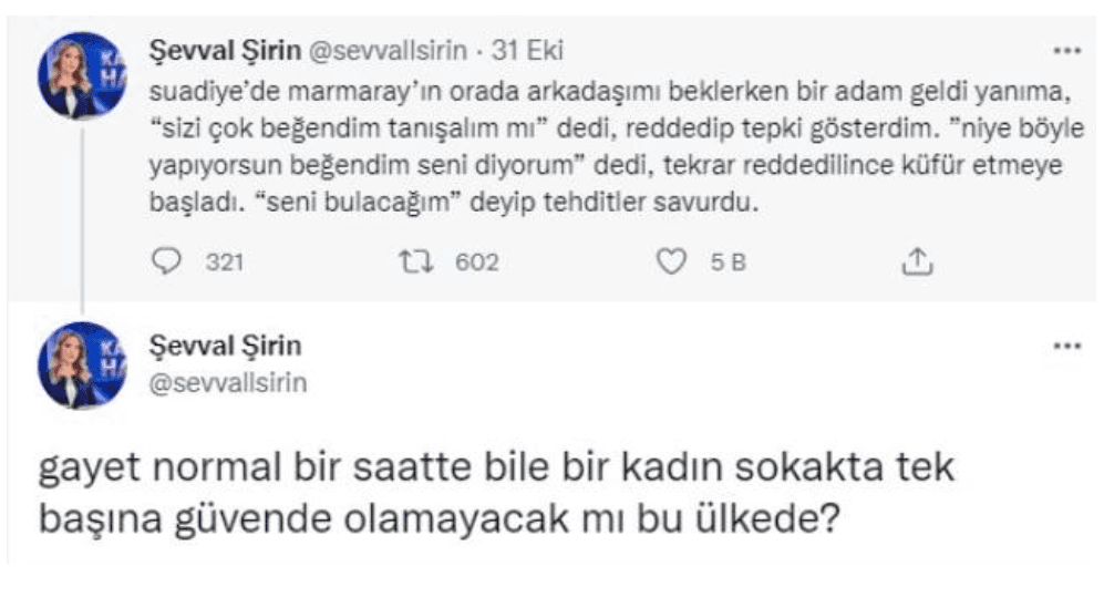 Şevval Şirin, Twitter hesabından yaptığı paylaşımda, "Suadiye'de Marmaray'ın orada arkadaşımı beklerken bir adam geldi yanıma, 'Sizi çok beğendim tanışalım mı?' dedi, reddedip tepki gösterdim. 'Niye böyle yapıyorsun beğendim seni diyorum' dedi, tekrar reddedilince küfür etmeye başladı. 'Seni bulacağım' deyip tehditler savurdu. Gayet normal bir saatte bile bir kadın sokakta tek başına güvende olamayacak mı bu ülkede?" ifadesini kullandı.