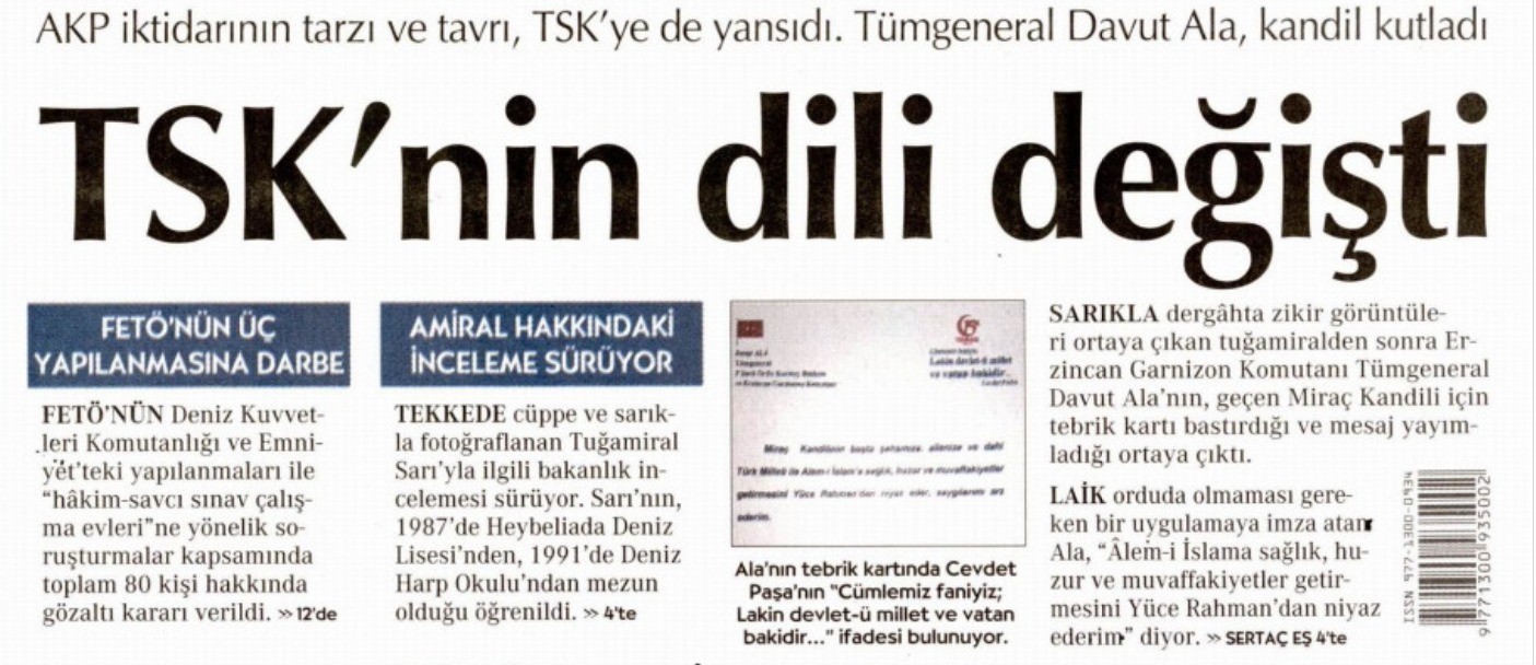Laiklik kılıfıyla İslam düşmanlığı yapmayı görev bilen paçavra, “Laik orduda olmaması gereken bir uygulamaya imza atan Ala…” nitelemesi yaparak Tümgeneral Ala’yı açıkça hedef gösterdi.