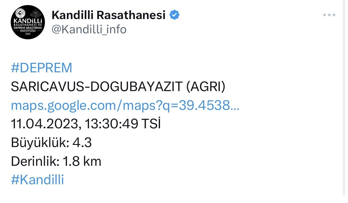 Kandilli Rasathanesi, Ağrı’nın Doğubayazıt ilçesinde 4.3 büyüklüğünde deprem meydana geldiğini açıkladı.