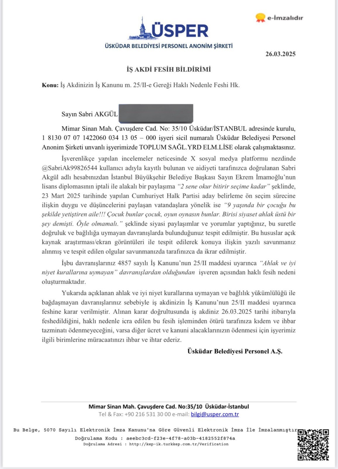CHP’li Üsküdar Belediyesi’nin bir çalışanını, tutuklanarak cezaevine gönderilen CHP’li eski İstanbul Büyükşehir Belediye (İBB) Başkanı Ekrem İmamoğlu’na yönelik birkaç paylaşımı yüzünden bayram öncesi kovdu.