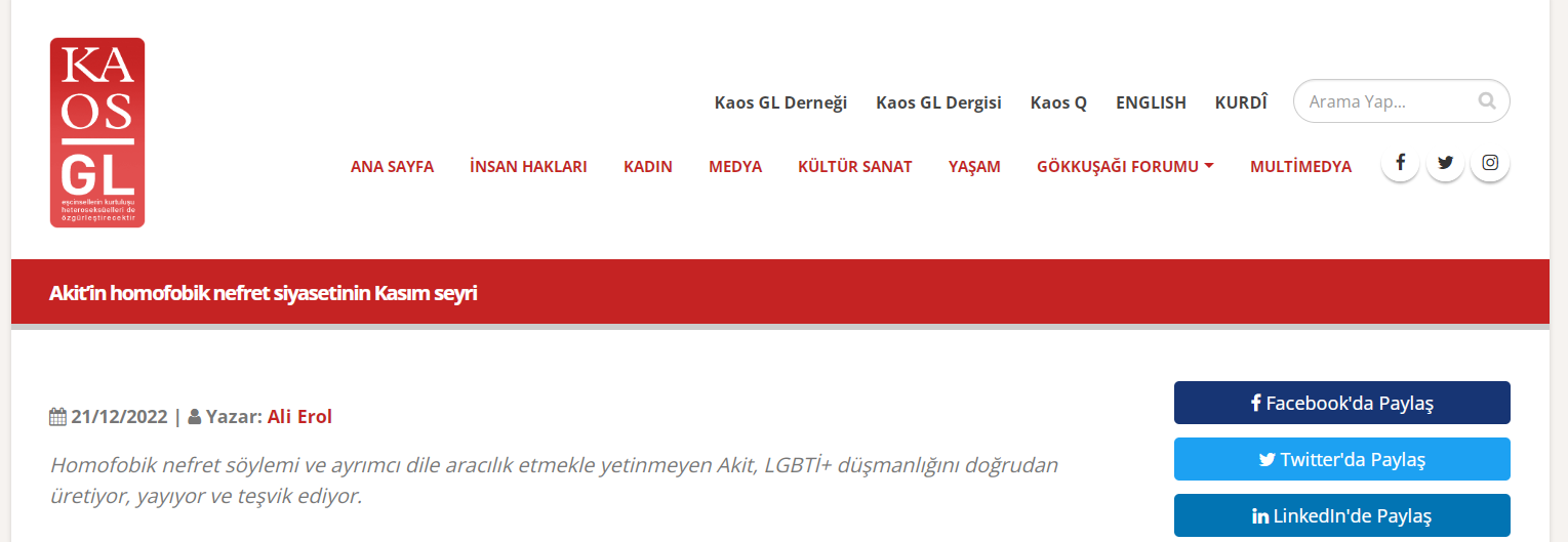 Kaos GL Derneği’nin Medya İzleme Raporu’na göre, sistematik karalama ve nefret kampanyalarıyla LGBTİ+’ları ve LGBTİ+ örgütlerini hedef haline getiren hükümet yanlısı muhafazakâr medya organlarından Yeni Akit, ayrımcı diliyle homofobik nefret söylemini 2022’nin Kasım ayında da sürdürdü.