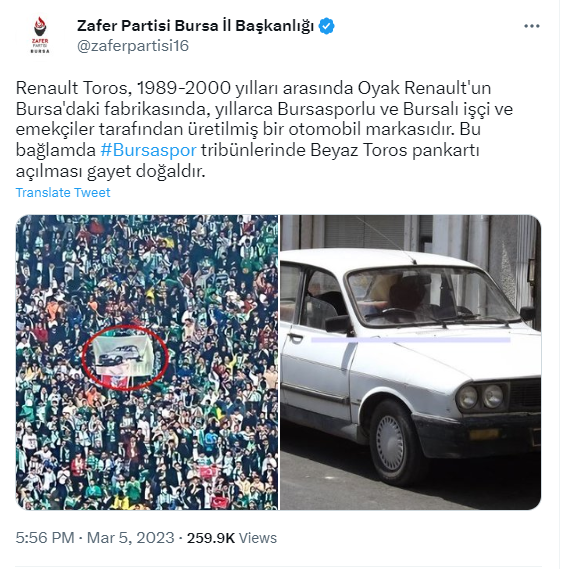 Bursaspor-Amedspor maçında tribünleri provoke eden Zafer Partisi Bursa İl Başkanlığı'nın resmi Twitter hesabından 'Beyaz Toros' paylaşımı geldi.