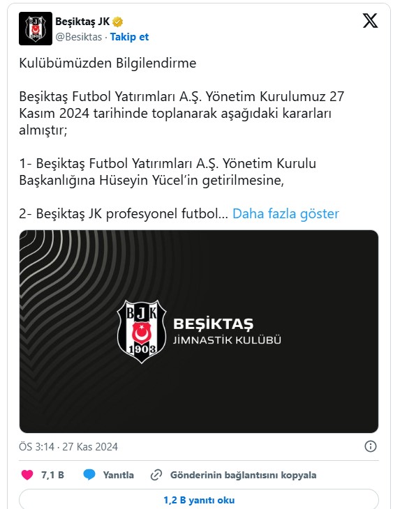 Kulübün sosyal medya hesabından yapılan paylaşımda ise şu ifadeler kullanıldı, "Beşiktaş Futbol Yatırımları A.Ş. Yönetim Kurulu Başkanlığına Hüseyin Yücel’in getirilmesine, Beşiktaş JK profesyonel futbol takımı sorumluluğuna Beşiktaş Futbol Yatırımları San. ve Tic. A.Ş. Yönetim Kurulu Başkanı Hüseyin Yücel ile Beşiktaş Jimnastik Kulübü Asbaşkanları Mete Vardar ve Onur Göçmez ile Yönetim Kurulu Üyesi Feyyaz Uçar’ın getirilmesine toplantıya katılan üyelerin oy birliğiyle karar verilmiştir."