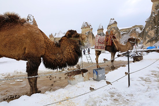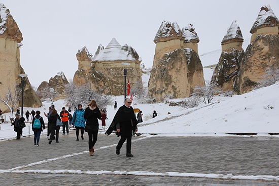 Kapadokya bölgesinde etkili olan kar yağışı peribacalarını beyaza bürüdü, yerli ve yabancı turistler karla kaplı doğal kaya oluşumları arasında fotoğraf çektirdi.