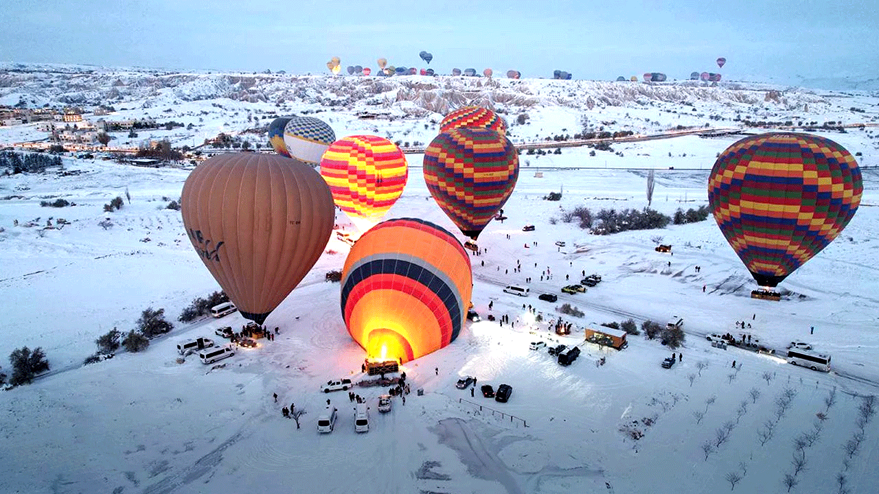 Türkiye'nin önemli turizm merkezlerinden Kapadokya'da etkili olan kar yağışı ve rüzgar nedeniyle bugün gerçekleştirilemeyen sıcak hava balon turları yarın da yapılamayacak.