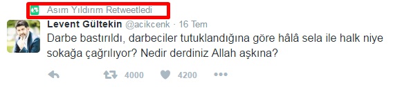Asım Yıldırım'ın, Twitter hesabından 'retweet' ettiği/ paylaştığı tweette "Darbe bastırıldı, darbeciler tutuklandığına göre hala sela ile halk niye sokağa çağrılıyor? Nedir derdiniz Allah aşkına?" ifadeleri yer aldı.