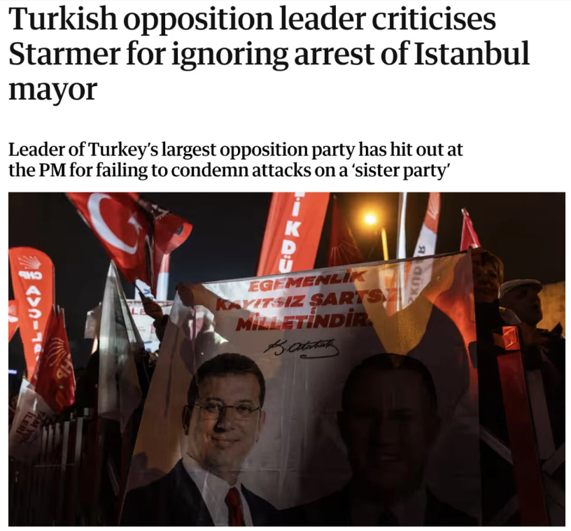 Gazetedeki söz konusu haberde, "İşçi Partisi liderlerinin ve Starmer'ın, CHP'li siyasetçi Ekrem İmamoğlu'nun geçen ay gözaltına alınmasının ardından tam bir kınama yapmamasından duyduğu rahatsızlığın altını çizen Özel, 'Bunu Türkiye'nin iç meselesi olarak görerek tarihi bir hata yapıyorlar' dedi." ifadelerine yer verildi.