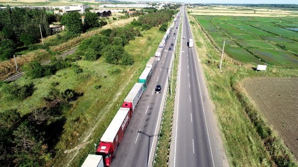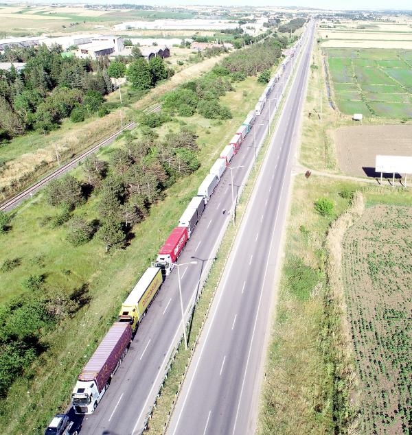 Edirne'de, Bulgaristan'a açılan Kapıkule Sınır Kapısı'ndan yurt dışına çıkış yapmak için gelen TIR sürücüleri, 22 kilometrelik kuyruk oluşturdu.