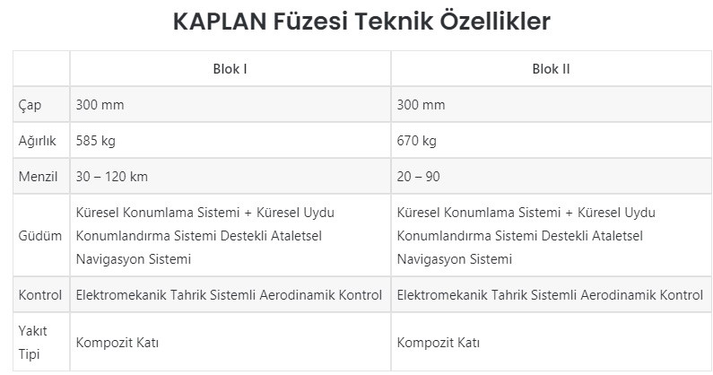 Roketsan tarafından geliştirilen TRG-300 KAPLAN Füzesi, Türk Silahlı Kuvvetleri tarafından Irak ve Suriye’ye yönelik icra edilen sınır ötesi harekatlarda aktif olarak kullanılıyor. Yaklaşık 120 kilometre menzili bulunan TRG-300 KAPLAN Füzesi, düşük dairesel sapma (CEP) değeri ile kara hedefleri üzerinde güçlü etki oluşturma kabiliyetine sahip.