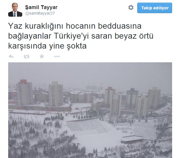 Yaz kuraklığının, sel ve felaketlerin, edilen beddualar sebebiyle meydana geldiğini iddia eden paralel örgüt mensupları, dün Türkiye'nin birçok yerinde başlayan kar yağışıyla hayretlere düştü.