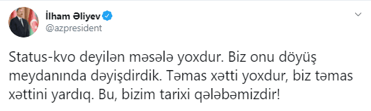 Azerbaycan ve Ermenistan dışişleri bakanlarının Moskova’da görüşmeleri devam ederken Azerbaycan Cumhurbaşkanı İlham Aliyev Twitter hesabından paylaşımda bulundu. Aliyev yaptığı paylaşımda, “Sözde statüko yok. Biz onu savaş alanında değiştirdik. Temas hattı yoktur, biz temas hattını aştık. Bu bizim tarihi zaferimiz!” ifadelerini kullandı.” ifadelerini kullandı.