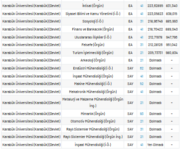 Karabük Üniversitesi 4 yıllık taban puanları 2021, yüzdelik dilimleri ve kontenjan sayıları kaçtır?