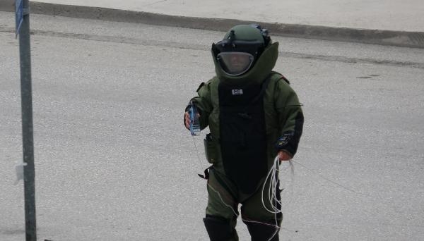 Bomba imha uzmanı özel kıyafetini giyerek yaklaştığı valizi fünye ile patlattı.