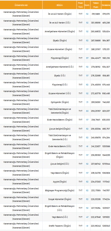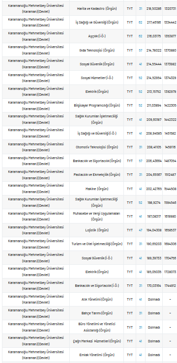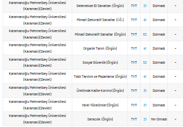 Karamanoğlu Mehmet Bey Üniversitesi 2 yıllık taban puanları 2021, yüzdelik dilimleri ve kontenjan sayıları kaçtır?