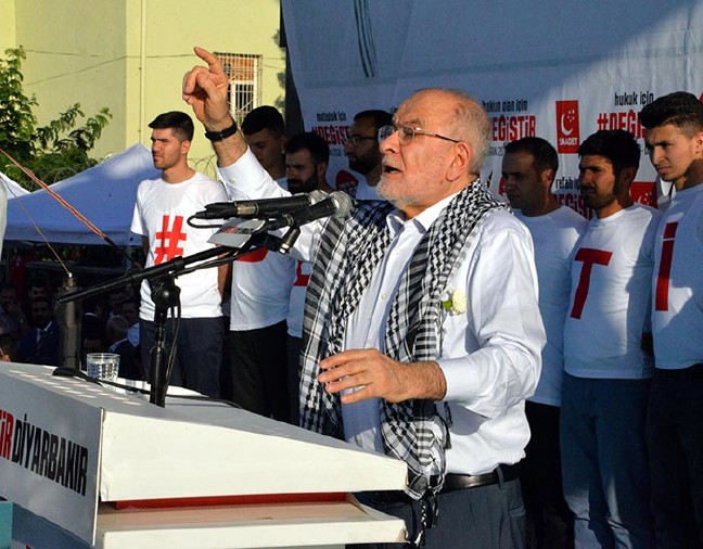 SP Genel Başkanı ve cumhurbaşkanı adayı Temel Karamollaoğlu, partisinin Diyarbakır'da düzenlediği mitinge katıldı. İstasyon Meydanı'nda düzenlenen mitingde konuşan Karamollaoğlu, geçmişte erken seçimi demokrasiye indirilen bir darbe olarak gören iktidarın, alel acele seçime gitme kararı aldığını söyledi. Karamollaoğlu, "Bizim iktidarımızda herkes mesut olacak, herkese el uzatacağız, herkesin kalbini kazanacağız. 'Erken seçimin sebebi neydi' diye baktığımızda çığ gibi büyüyen problemlerle karşı karşıya olduğumuzu görüyoruz. Ekonomide dibe vurdu bu iktidar, ülkenin problemlerini artık çözemiyor. İşsizlik zirve yaptı, dolar aldı başını gidiyor. İnsanlar geçimlerini sağlayamıyor. Dış politikada, adalette, eğitimde, her yerde sıkıntı var. 15.5 yıldır iktidarda bulunan bu parti, bugünkü sıkıntıları hazırladı. Bu sıkıntları bunlar bu ülkenin başına getirdi. Artık bu iktidarın ülkemizin problemlerini çözemeyeceğini gördük. Artık, bir değişime ihtiyaç var. Bu iktidarı siz değiştireceksiniz. Bu değişimin ayak seslerini de duymaya başladık" dedi.