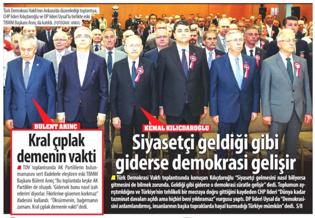 Gelecek Partisi'nin gazetesi Karar'da yer alan demokrasi temalı CHP fotoğrafı görenleri güldürdü!.. Gazete, Bülent Arınç'ın sözlerine atıp yaparak, "Kral çıplak demenin zamanı geldi" ifadesine yer verdi ancak muhalifler kendi krallarının çıplak olduğunu gözler önüne serdi!..