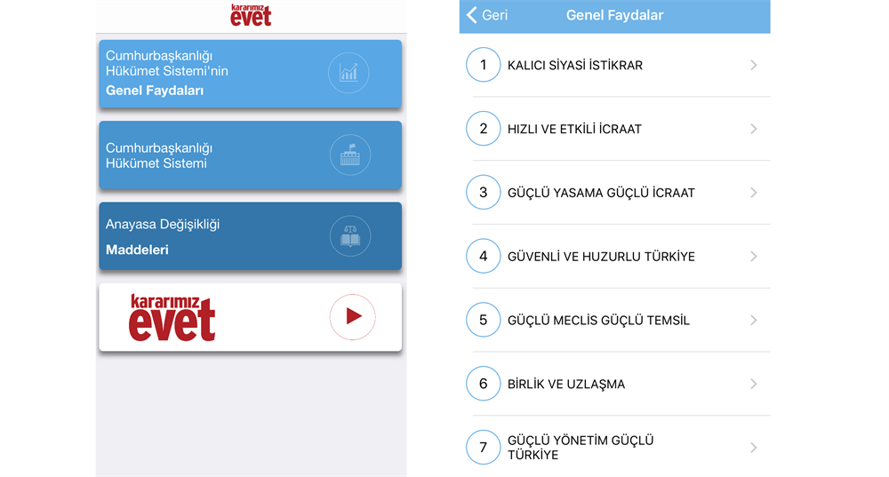 AK Parti'nin referandum süresince yürüteceği 'evet' kampanyasının mobil uygulaması yayınlandı. Google Play ve App Store'dan indirilebilen bu uygulama, akıllarda soru işareti kalmaması adına Cumhurbaşkanlığı Hükümet Sistemi'nin genel faydalarını, bu sistemin nasıl işlediğini ve anayasa maddelerindeki değişikliğin neler olduğunu açıklayıcı bir şekilde aktarıyor.