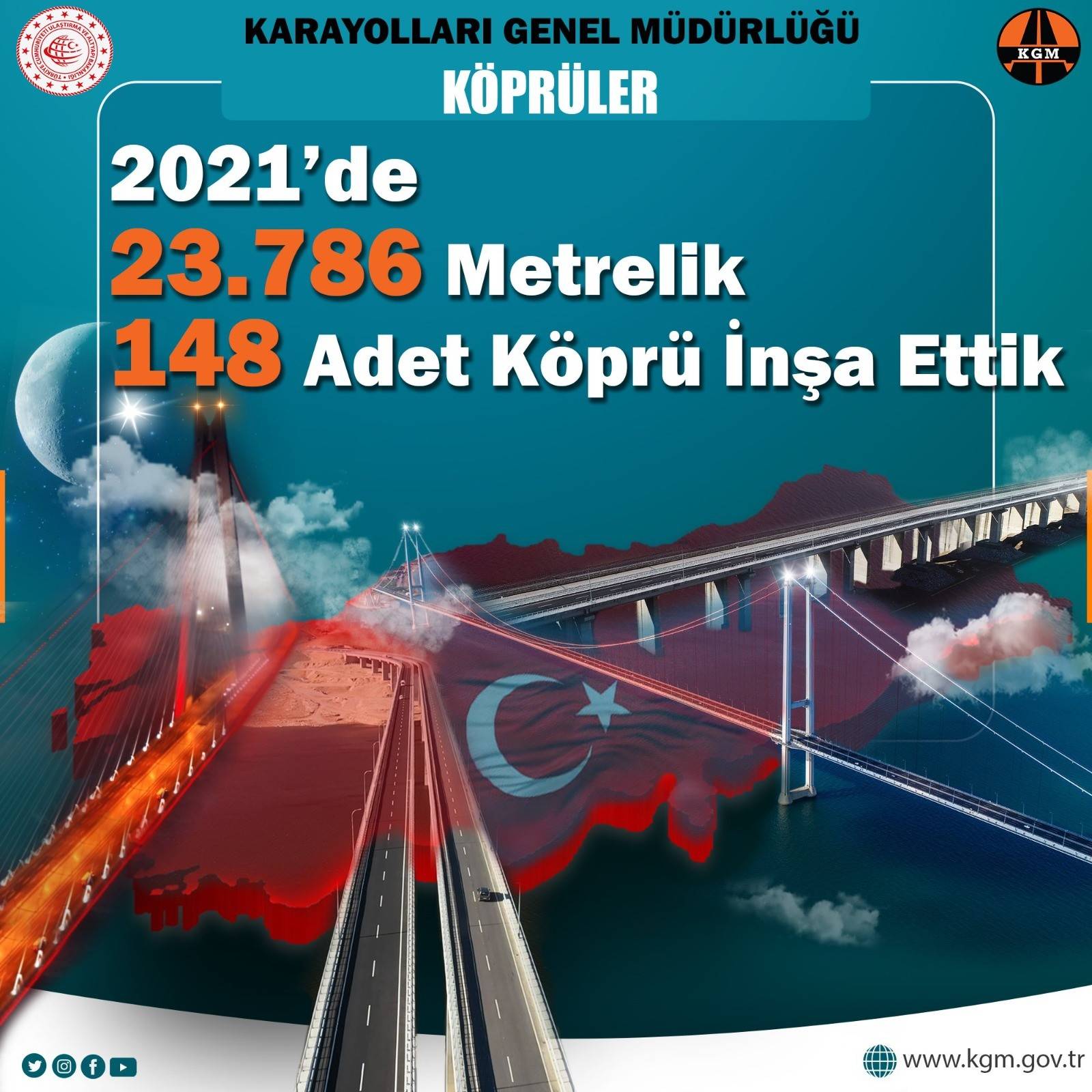 Karayolları Genel Müdürlüğü 2021 yılında hizmete sunulan önemli yatırımları resmi sosyal medya hesabından tek tek paylaştı. Yapılan paylaşımlarda, köprülerin, tünellerin bölünmüş yolların toplan uzunlukları ve sayıları belirtildi. Karayolları Genel Müdürlüğü tarafından köprülerle ilgili verilen bilgilerde, “23 bin 786 metre uzunluğunda 148 adet köprü inşa ederek köprü sayımızı 9 bin 584'e, toplam uzunluklarını ise 724 bin 146 metreye çıkardık” ifadeleri yer alırken, tünellerle alakalı olarak, “Toplam uzunluğu 60 bin 974 metre olan 31 adet tünel inşa ederek tünel sayımızı 466'ya, toplam uzunluklarını ise 651 bin 314 metreye çıkardık” denildi. Ayrıca bölünmüş yollarla alakalı olarak da, “Bölünmüş yol uzunluğumuzu 350 km artırarak toplam bölünmüş yol ağımızı 28 bin 546 km'ye çıkardık” bilgisi paylaşıldı.