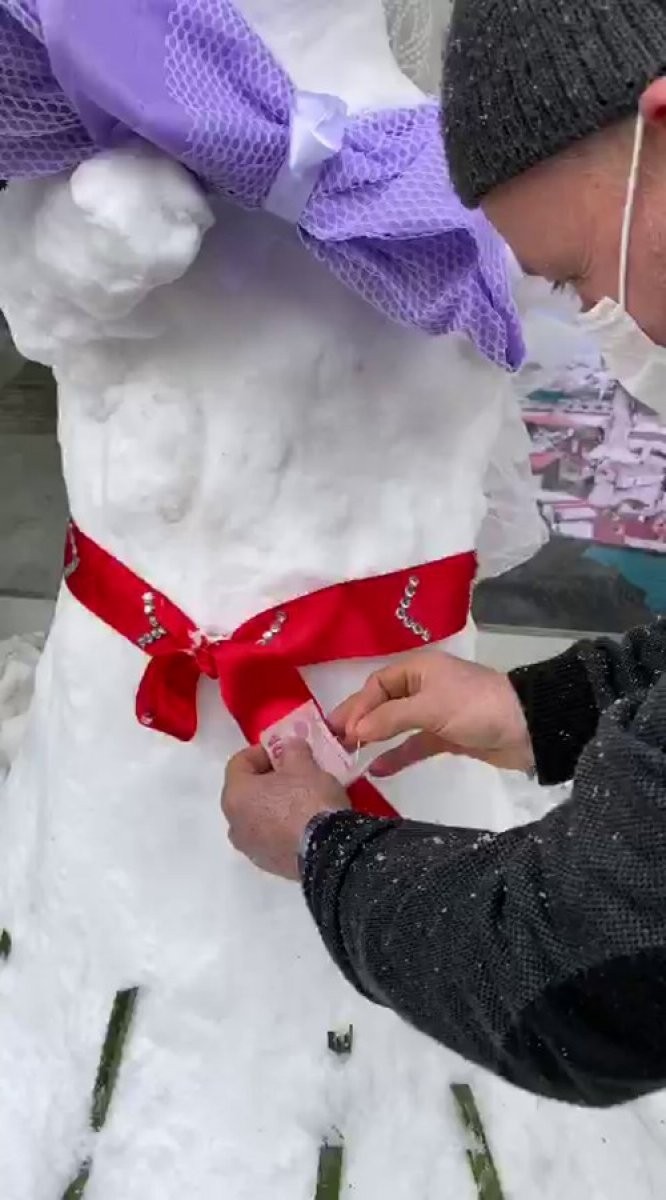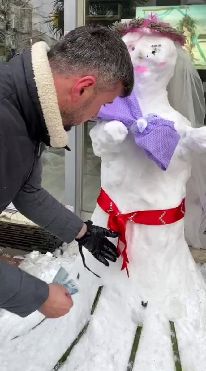 Arnavutköy'de bir esnaf, iş yerinin bulunduğu sokakta kardan gelin yaptı. Yoldan geçenlerin takı taktığı kardan gelinin üzerinde biriken paralarla sokak hayvanlarına mama alındı.