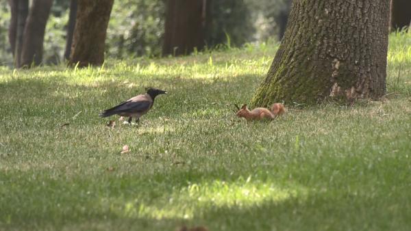 İstanbul Yıldız Parkı'nda b,r karga ile sincabın ekmek kırıntıları için ettiği kavga kameralara yansıdı.