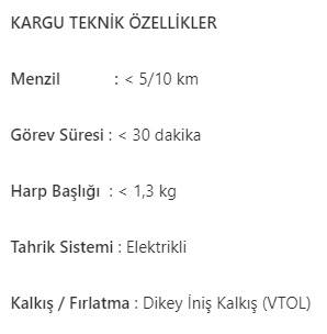 “Vurucu Döner Kanatlı İHA (VİHA)” ve “Yer Kontrol Ünitesi”nden oluşan KARGU, “man in the loop” prensibi ile tamamen insan (operatör) kontrolünde görev icra edecek şekilde tasarlanmıştır. Gündüz ve gece etkin operasyon yapabilen sistem, hassas vuruşa sahiptir. Görev iptali, eve dönüş ve kendini imha kabiliyetlerine sahip KARGU, yüksek performanslı seyrüsefer ve kontrol algoritmaları ile donatılmıştır.