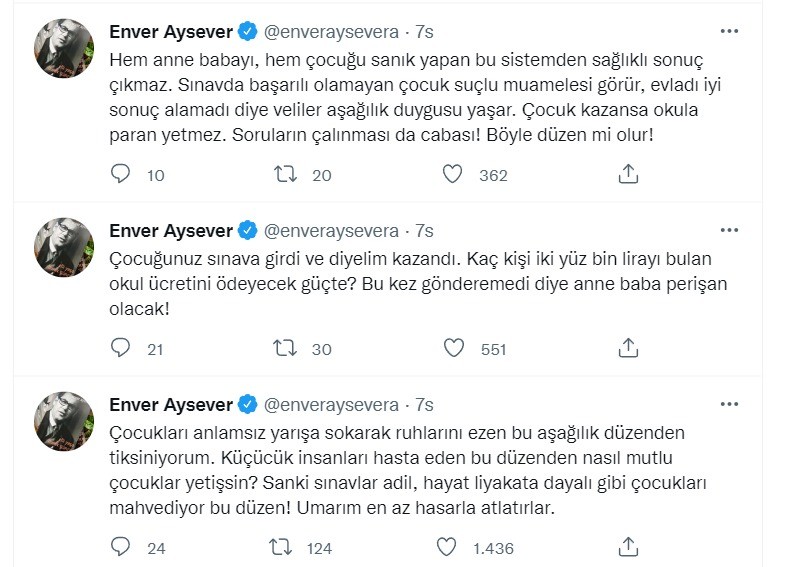 "Hem anne babayı, hem çocuğu sanık yapan bu sistemden sağlıklı sonuç çıkmaz." diyen Enver Aysever, "Sınavda başarılı olamayan çocuk suçlu muamelesi görür, evladı iyi sonuç alamadı diye veliler aşağılık duygusu yaşar. Çocuk kazansa okula paran yetmez. Soruların çalınması da cabası! Böyle düzen mi olur!" ifadelerini kullandı.