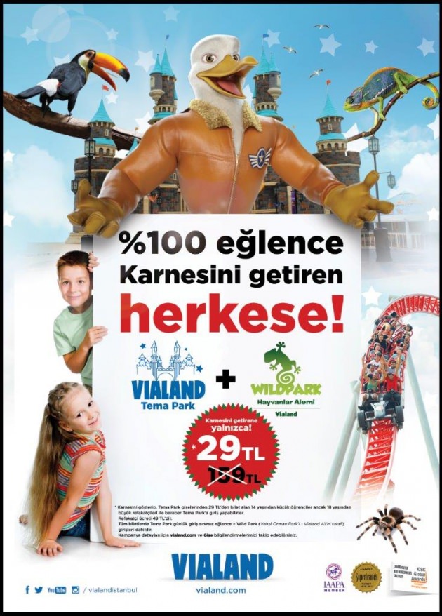 8 Şubat’a kadar karnesini getiren tüm öğrenciler, Vialand Tema Park’a ve Vialand Avm’de bulunan Vahşi Yaşam Parkı Wild Park’a toplamda yalnızca 29 Tl ödeyecek. 14 yaş altı çocukların birlikte gelecekleri yetişkinler için de fiyat 49 Tl olacak. 7'den 77'ye her yaşın eğlenecek ve öğrenecek birşeyler bulduğu Vialand Tema Park; Dora, Diego'nun Maceraları, Sünger Bob Kare Pantolon, Minik Kaşifler gibi üniteleriyle Sömestre tatili için miniklerin tercihi olacak. Vialand; "Fatih'in Rüyası" ile, İstanbul'un Fethini gizemli bir yolculukla yaşatırken, "İstanbul'un Sırları" ise, keyifli bir İstanbul tarihi yolculuğuna çıkarıyor. Dünyanın farklı bölgelerinden gelen Vahşi hayvanları doğal ortamlarında tanıma fırsatı sunan Wild Park ise, hem çocuklar hem de yetişkinler için etkileyici bir Vahşi yaşam yolculuğu yaşatıyor. Vialand Tema Park; sömestre tatili süresince sabah 10.00-18.00 saatleri arasında açık olacak.