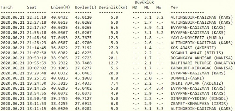 Boğaziçi Üniversitesi Kandilli Rasathanesi ve Deprem Araştırma Enstitüsü'nden alınan bilgiye göre, bugün saat 18:11'de 3,3, 19:14'te 3,4, 21:55'te 3,2 ve 22:17'de 4,1 büyüklüğünde merkez üssü Kars olan 4 deprem meydana geldi.