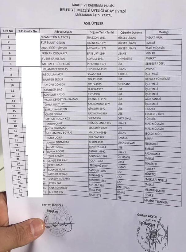 AK Parti Kartal İlçe Başkanlığı, İlçe Seçim Kurulu’na aday listesini teslim etti. İşte AK Parti Kartal Belediye Meclis üyesi aday listesi.