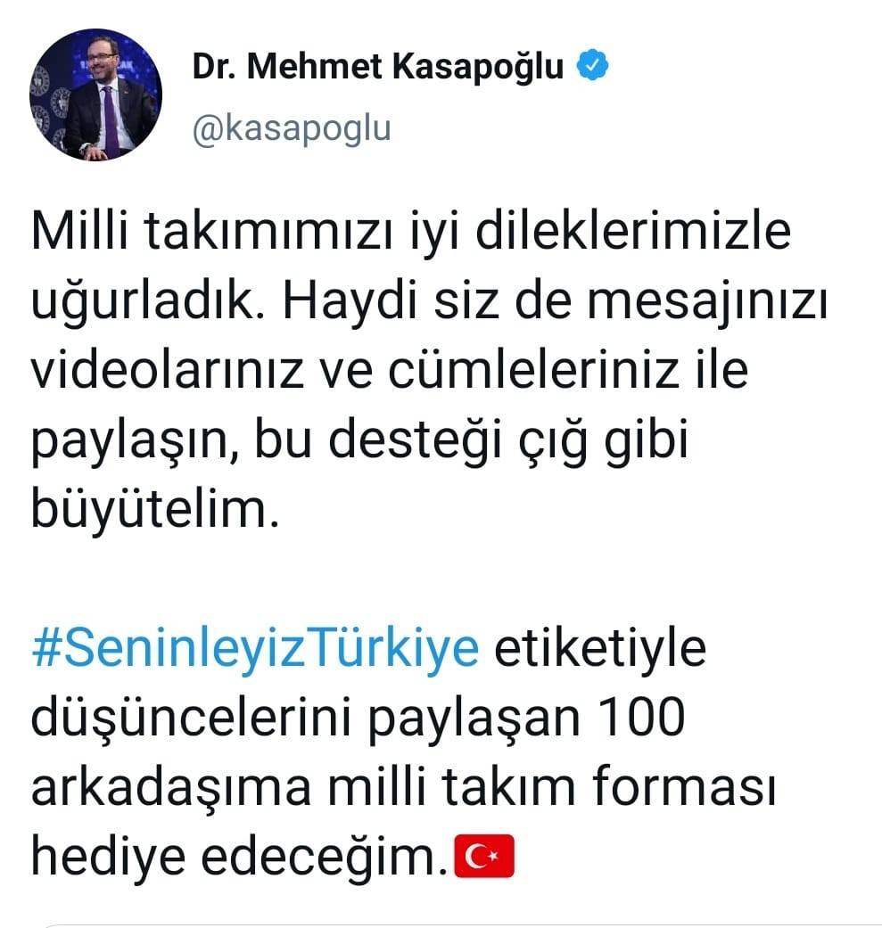 Gençlik ve Spor Bakanı Dr. Mehmet Kasapoğlu Euro 2020'de İtalya ile mücadele edecek olan Milli Takımımız için sosyal medya hesabından bir destek mesaji yayınladı. Ayrıca Kasapoğlu #SeninleyizTürkiye etiketiyle paylaşım yapan 100 kişiye Millî takım forması hediye edeceğini söyledi.